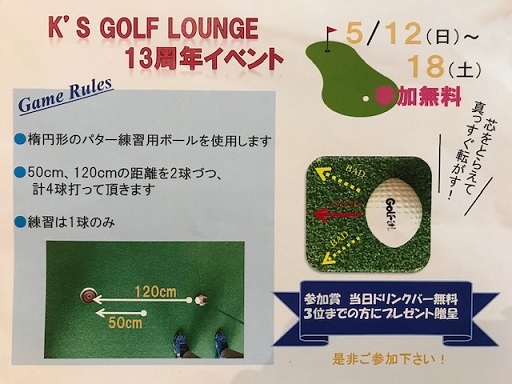 本日より! 2019/05/12 今週、K’s GOLF LOUNGEはオープン13周年を迎えます本日より一週間、記念イベントを開催致しますので是非ご参加下さい! 今年はラグビーボールのような形をしたボールを使ったパターゲームですきちんとインパクトしないと右に左に転がってしまいます良い練習になりますので普段の練習でも是非お使い下さい パターは練習して腕を磨けばプロにも勝てる可能性はあります!頑張りましょう! by take