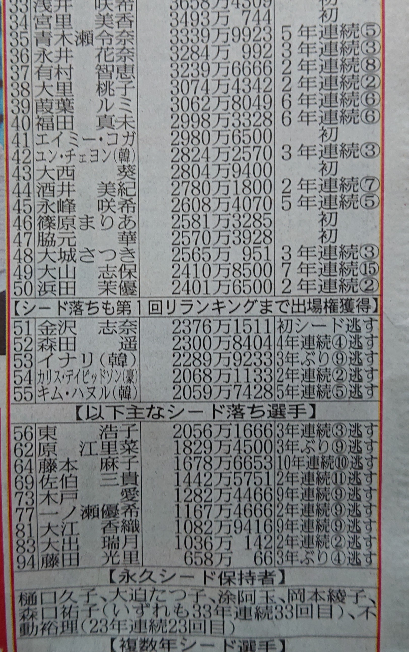 女子のシードは50位なので入れ替わりも激しいですからね