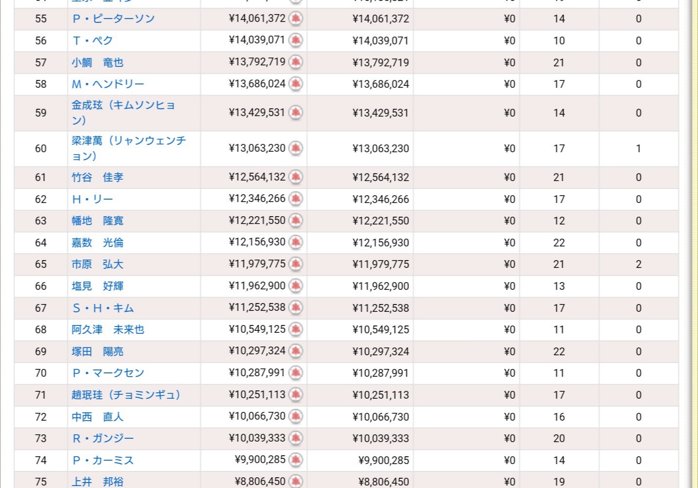 男子は74位の選手は1000万に到達していませんが、女子は83位でも超えてます